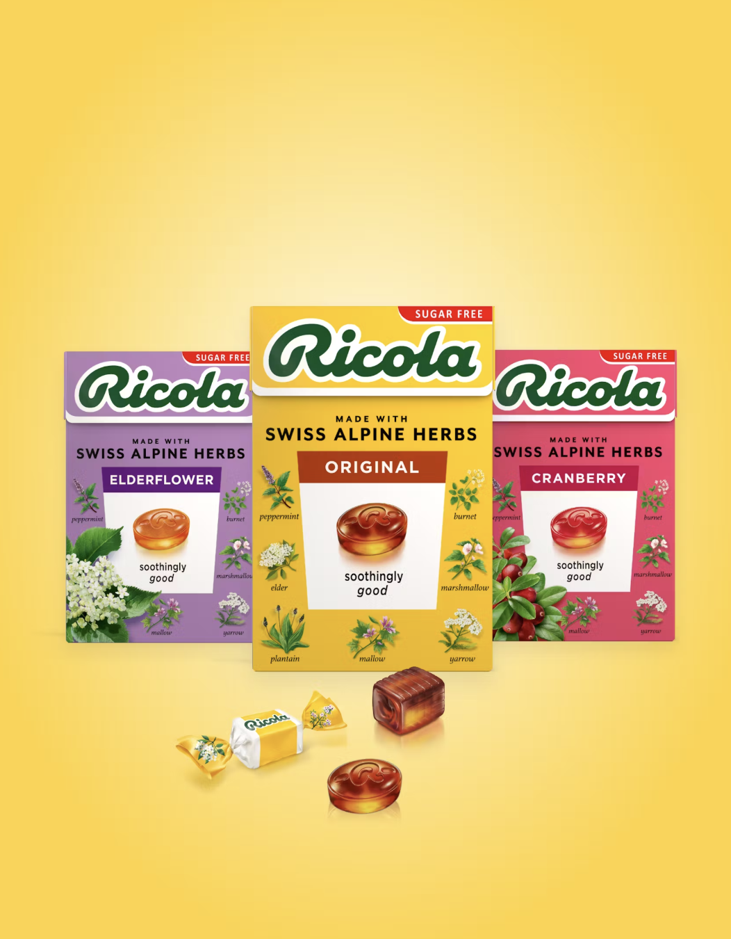 ลูกอมแก้เจ็บคอสีเหลืองอีกหนึ่งแบรนด์ที่คนถามหากันเยอะ โดยกล่องนี้ไม่ใช่ยาอมแก้เจ็บคอจากจีน แต่มาจากสวิตเซอร์แลนด์เลยทีเดียว ใน 1 เม็ดสี่เหลี่ยมเล็ก ๆ จะประกอบไปด้วยสมุนไพรออร์แกนิก 13 ชนิด เช่น เปปเปอร์มินต์, เสจ, ไทม์ ฯลฯ ปราศจากน้ำตาล แต่มีหญ้าหวานและกลิ่นคาราเมลเพิ่มรสชาติ มีสรรพคุณบรรเทาอาการระคายเคืองคอ ช่วยให้ชุ่มคอ